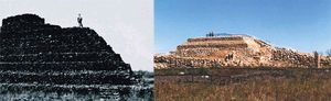 Prahls Fazit zur kulturellen Diffusion des Pyramidenbaus fällt jedenfalls angesichts der genannten Tatsachen eindeutig aus: "In Anbetracht der Fakten sieht es so aus, dass die Pyramiden von Guimar in Anlehnung an amerikanische Formen errichtet wurden"[11] , wobei die Frage zu klären bleibt, wie diese Bauweise von den Kanarischen Inseln an den Nil gelangten. Thor Heyerdal entdeckte jedenfalls auch auf der zentral-mediterranen Insel Sizilien einen schwar-zen Stufen-Pyramidoiden ähnlichen Typus´ wie auf den Kanaren. Eine weiteres Exemplar fand sich, unabhängig von Heyerdahls Suche, auf der Insel Sardinien: Dieser so genannte "Monte d'Accodi", der konventionell auf ca. 2700 v. Chr. datiert wird, besteht zwar nicht aus schwarzem Vulkangestein, weist aber starke architektonische Ähnlichkeiten mit seinen dunklen "Geschwistern" von den Kanaren auf, die anscheinend nicht zufälliger Natur oder das Ergebnis obskurer kultureller Parallel-Entwicklungen sind.