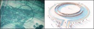 Entdeckt wurden die Uralt-Ruinen aus der Luft. (Abb. 2, links) Die Bau-Struktur bestand zur Zeit ihrer Benutzung offenbar aus vier konzentrischen Ringen - einem Mound, einem Graben und zwei etwa mannshohen Holz-Palisaden - mit Toren in südöstlicher, südwestlicher und nördlicher Richtung. Im Scientific American stellt der Autor Madhusree Mukerjee dazu fest: "Zur Winter-Sonnenwende hätte man aus dem Zentrum der Ringe durch die südwärtigen Tore den Sonnenauf- und -untergang beobachten können." [2]