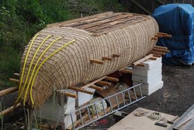 The miscanthus, also known as Chinese reed, was finally loaded and transported to Chemnitz, about 100 km away, where we have now brought it to our main warehouse. In mid-May, it will be transported on to Thuringia to replace the aging reed matting on the hull of our raft. We built this raft more than 10 years ago in Gotha, Thuringia. The raft has proven itself to be excellent and is still in good condition.
