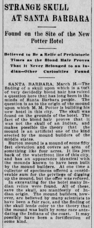 "SANTA BARBARA, 16. März - Der Fund eines Schädels, auf dem sich ein Büschel ganz eindeutig blonden Haares befindet, hat hier eine Frage aufgeworfen, die schon lange in den Köpfen der Menschen von Santa Barbara steckt. Diese Frage betrifft den Ursprung des Hügels, auf welchem M.M. Potter sein neues Hotel in dieser Stadt baut. Der Schädel wurde auf dem Gelände des Hotels entdeckt. Das Faktum des blonden Haares beweist, dass es nicht der Schädel eines Indianers ist, und ermöglicht die Theorie, dass der Hügel künstlicher Natur und ähnlicher Art ist wie jene, die von den Moundbauern der mittleren Staaten errichtet wurden.
