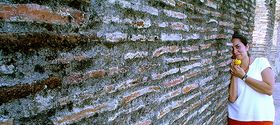 The architecture of the sacred buildings as well as the temple construction can clearly be attributed to Mayan architecture. But why did the Maya renounce all other materials, such as limestone or aldobe bricks, here of all places? Coincidence or favored by the sea situation an indication of an overseas contact?Die Nahaufnahme mit der Frau im Hintergrund zeigt die Größe der gebrannten Ziegel als auch deren schmales Format. Das erinnert stark an römische Ziegel. Hinzu kommen die Maurerzeichen, die ebenfalls Hinweise für einen Kontakt liefern.//