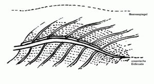 Nur die am stärksten aktiven Vulkankegel ragten nach einigen Wochen noch aus der entstandenen Sedimentschicht von vielen hundert Metern Dicke heraus. Sedimenthöhen von 800 bis 1.000 Meter und mehr sind über dem Pazifikboden gemessen worden 6. Diese schnellen und mächtigen Sedimentablagerungen im ganzen Pazifik- und Atlantik- Bereich erklären auch mühelos das plötzliche weltweite Ansteigen der Meeresspiegel um bis zu 200 Meter. Nach Rückzug der Flutwellen aus allen kontinentalen Flachgebieten blieben daher große Zonen, vor allem küstennahe, für immer unter Wasser. Dadurch versanken auch viele vor-antike küstennahe Bauwerke unter der Wasseroberfläche. Entlang der Hauptdruckzone brach die schwächste Struktur. Das ist die Ozeanische Erdkruste.