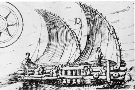 Abb. 1 Abbildung eines seetüchtiges Seglefloßes nativer Altamerikaner der Küstenregion des andinen Raums. Im Gebiet der Karibik verfügten ameride Seefahrer schon vor der Ankunft der modernen Eurpäer über ähnlich hochentwickelte Wasserfahrzeuge.