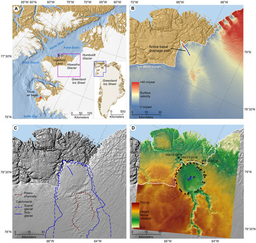 - ↑ Siehe: Kurt H. Kjær, Nicolaj K. Larsen, Tobias Binder, Anders A. Bjørk1, Olaf Eisen, Mark A. Fahnestock, Svend Funder, Adam A. Garde, Henning Haack, Veit Helm, Michael Houmark-Nielsen, Kristian K. Kjeldsen, Shfaqat A. Khan, Horst Machguth, Iain McDonald, Mathieu Morlighem, Jérémie Mouginot, John D. Paden, Tod E. Waight, Christian Weikusat, Eske Willerslev und Joseph A. MacGregor, "A large impact crater beneath Hiawatha Glacier in northwest Greenland", 14. November 2018, bei Science Advances, Vol. 4, No. 11 (DOI: 10.1126/sciadv.aar8173; abgerufen: 13. März 2019)