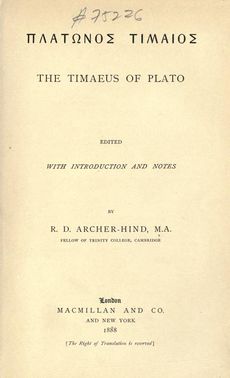 (red) Richard Dacre Archer-Hind (* 18. September 1849 auf Morris Hall, nahe Norham, England; † 6. April 1910 in Cambridge) war ein auf Werke Pindars, Æschylos’, Sophokles’ und insbesondere Platons spezialisierter Klassischer Philologe, der an der Universität Cambridge lehrte. [1] Archer-Hinds bekanntestes Werk ist seine 1888 erschienene, kommentierte Übersetzung von Platons Dialog >Timaios< (Abb. 1).