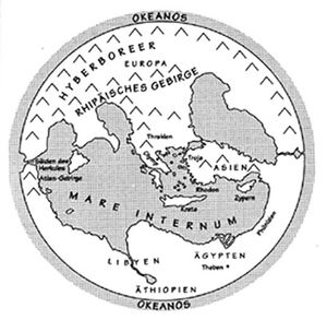 Im Westen hatte er wohl vage von den Völkern Süditaliens und Siziliens gehört, den Sikulern und Sikanern, doch das sind für ihn bloße Namen [5]. Wenn Odysseus das Land der Lotophagen verläßt, segelt er in ein Zauberreich, in dem es Inseln wie Aiaia sowie Ogygia und Monstren wie Polyphem gibt. Der Verfasser platziert sie, wohin immer er sie haben will. Schließlich besitzt Homer keine wirkliche Vorstellung vom Atlantischen Ozean, da für ihn die Welt noch immer von einem großen Fluß, dem "dahinströmenden Weltstrom Okeanos" umflossen wird. Als der Atlantik den Griechen später vertraut wurde, nannten sie ihn den "Ozean", da er für sie da lag, wo sie sich zuvor den mythischen Fluß gedacht hatten. Niemand machte sich jemals die Mühe, zu erklären, wieso solch ein Strom, der seine Schwanzspitze im Mund hielt wie die Schlange Ouroboros auf alten okkulten Symbolen, immer rund herum fließen sollte (was sie offensichtlich annahmen).