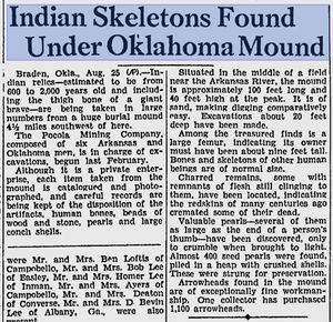 "Braden, Oklahoma, 25. August (AP) - Indianische Relikte - geschätzt auf ein Alter von zwischen 600 und 2000 Jahren, und einschließlich des Oberschenkelknochens eines riesenhaften Kriegers - werden in großer Zahl einem enormen Mound, viereinhalb Meilen südwestlich von hier, entnommen.