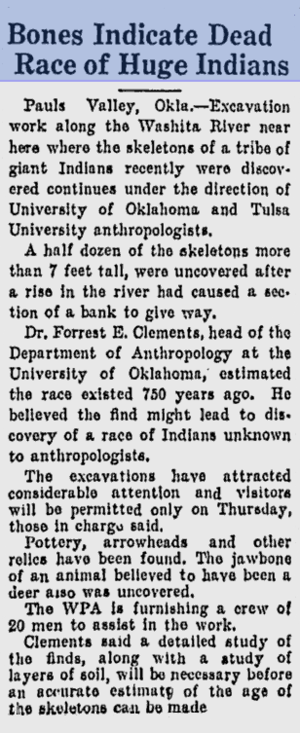 Über die vorausgegangenen Grabungen unter Dr. Clements hatte bereits am 24. Mai die Zeitschrift Reading Eagle (Abb. 3) aus Pennsylvanien unter Berufung auf die Nachrichtenagentur United Press folgendes berichtet: "Norman, Oklahoma, 24. Mai (UP) - Sechs riesige Skelette eines befremdlichen Stammes von mehr als sieben Fuß [ca. 2,13 m; d.Ü.] großen Indianern sind entlang der Ufer des Washita River im südlichen Zentral-Oklahoma freigelegt worden, wie Dr. Forrest E. Clements, Leiter der anthropologischen Fakultät der University of Oklahoma heute enthüllte.