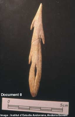 Dann, um etwa 18 000 v. Chr. wird die Aurignac-Kultur von der nächsten Invasion einer Kultur "unterbrochen", die als Solutréen bekannt ist. Nur zwei Beispiele für die Höhlen-Kunst der Solutréener sind bekannt (Bordes, 1968). Die Solutréener scheinen sich durch die Produktion extrem delikater Klingen ausgezeichnet zu haben: außerdem haben sie möglicherweise auch die Verwendung von Pfeil und Bogen eingeführt. (Pfeiffer, 1969). Doch bereits nach weiteren viertausend Jahren - circa 14 000 v. Chr. - kommt es zur so genannten Invasion des Magdalenien, in dem erstmals die Harpune (Abb. 4) auftaucht. [2] Diese 'Invasionen' stehen alle im Zusammenhang mit Besiedlungswellen durch Cro-Magnon. Nie hat man auf einem der Kontinente frühe Entwicklungs- oder 'Embryomal'-Stadien irgendeiner der cro-magnoiden Werkzeug-Industrien gefunden. Wurden sie alle auf Atlantis entwickelt? "Die Evidenzen sprechen für ein mächtiges Volk, das überall dort leben konnte, wo es ihm beliebte . . . Und die archäologischen Daten geben noch mehr her. Das Leben veränderte sich als Reaktion auf . . . Ereignisse, die mit geologischen Kräften zu tun hatten und eine größere Bevölkerungs-Explosion verursachten. Erhalten gebliebene Zeichen dieses Wandels gibt es überall. Die rezentesten Magdalenier . . . bewohnten drei bis vier mal so viele Siedlungs-Plätze wie ihre Vorgänge, und sie besiedelten eine große Zahl von Orten, die noch nie zuvor in Anspruch genommen wurden." (Pfeiffer, 1969)