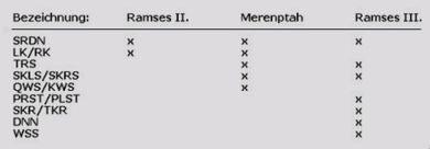 Die Namen der verschiedenen Seevölker sind - in ihrer ägyptischen oder ägyptisierten Form, nota bene ohne Vokale - hauptsächlich aus Inschriften und dem Papyrus Harris aus der Zeit der Pharaonen Ramses II., Merenptah und Ramses III. bekannt. Im einzelnen nennen diese drei Pharaonen nach Helck (1962) die in der nebenstehenden kleinen Matrix (Abb. 2) mit einem x bezeichneten von insgesamt neun Seevölker-Namen. Um nicht zu verwirren, sondern die ägyptische Schreibweise korrekt wiederzugeben, hat der Verfasser hier für diese Völkernamen nur die Konsonanten verwendet.