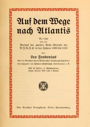 Dieser Betrag ist eine Transkription des 1. Kapitels ("Über die Bedeutung: >Atlantis<", S. 1-14) aus dem Buch "Auf dem Wege nach Atlantis - Bericht über den Verlauf der zweiten Reise-Periode der D.i.a.f.e. in den jahren 1908 bis 1910" von Leo Frobenius; erschienen 1911 in Berlin (Vita Deutsches Verlagshaus); nach der digitalisierten Fassung bei Archive.org