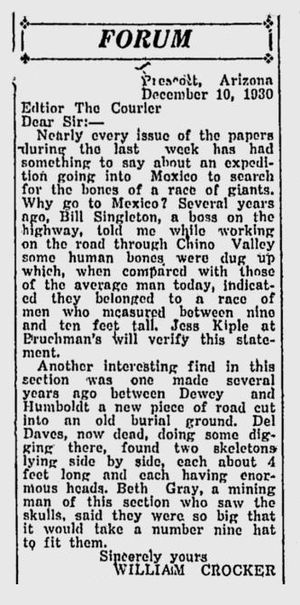 Wertvolle Informationen über einen weiteren Fund von Überbleibseln prähistorischer Riesen lieferte William Crocker aus Prescott in einem Leserbrief (Abb. 6) an den Prescott Evening Courier, den die Zeitung in ihrer Ausgabe vom 11. Dezember 1930 veröffentlichte: