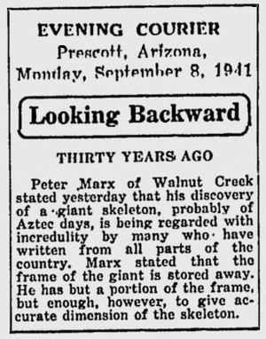 Einer der pressemäßig am besten dokumentierten Funde von Überresten eines riesenhaften Arizoniers der Vorzeit ist die Entdeckung, die ein Farmer namens Peter Marx im Oktober 1911 auf seinem Land in der weiteren Umgebung von Prescott machte. [5] Dieser Zufalls-Fund der Knochen eines bemerkenswerten Giganten von "mindestens der doppelten Große eines durchschnittlichen Mannes von heute" [6], mit dem wir uns an anderer Stelle ausführlicher befassen werden, interessierte damals nicht nur die Medien, sondern rief auch die Smithsonisn Institution auf den Plan. [7] Beim Prescott Evening Courier erinnerte man sich noch dreißig Jahre später an diese spektakuläre Begebenheit und erwähnte sie in der Ausgabe vom 24. November 1941 im Rahmen einer kurzen Retrospektive:
