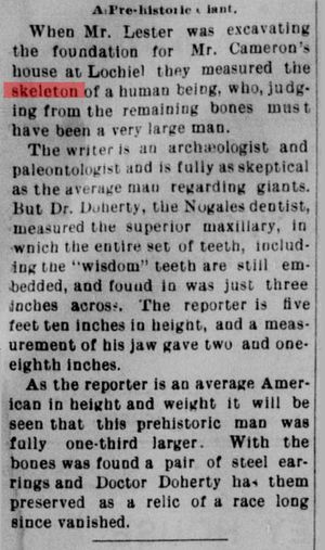 "Das Skelett eines prähistorischen Riesen wurde kürzlich von Mexikanern eine halbe Meile nördlich von Nogales, Arizona, entdeckt. Der Schädel ist doppelt so groß wie der eines gewöhnlichen Menschen, und die Zähne sind regelrechte Hauer, deren Länge von drei bis dreieinhalb Inches [ca 7,6 bis 9,8 cm; d.Ü.] reicht. Eine sorgfältige Vermessung des Skeletts platziert seine Größe auf 8 Fuß und 4,5 Inches [ca. 2,55 m; d.Ü.]. Es ist in einem bemerkenswert guten Erhaltungszustand " [3]