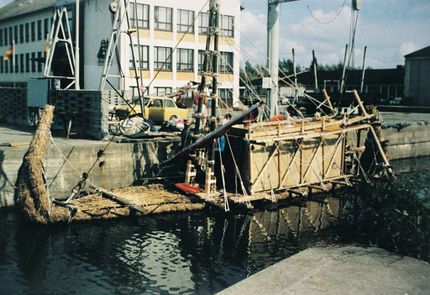 Dazu bauten wir aus deutschem Schilfrohr in 8 Wochen Bauzeit die 12 m lange und rund 4 t schwere DILMUN I (Abb. 1). Mit Unterstützung mehrerer Gothaer Sponsoren gelang es uns, das Boot nach Greifswald zu transportieren, wo wir auf dem ehemaligen Gelände der Marineschule (Segelschulschiff „Wilhelm Pieck“ heute „Greif“) die Unterkunft und den Bauplatz gesponsert bekamen. Weitere drei Wochen Auftakeln nach altägyptischen Vorbildern gingen ins Land, ehe wir unser Experiment auf der Ostsee starten konnten.