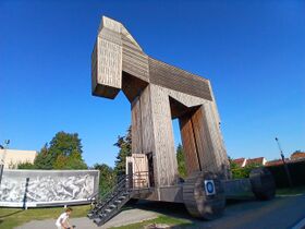 Der Nachbau des Trojanischen Pferdes in Stendal. Homer überliefert dazu: Nach langer erfolgloser Belagerung Trojas war es die Idee von Odysseus, ein Pferd als vermeintliches Abschiedsgeschenk zu bauen. Trotz Warnung zogen es die Trojaner in die Stadt. Die darin befindlichen Krieger öffneten nachts heimlich die Stadttore, was schließlich zur Eroberung und zur Vernichtung Trojas beitrug. //
