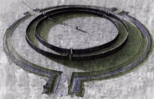 Entdeckt wurden die Uralt-Ruinen aus der Luft. (Abb. 2, links) Die Bau-Struktur bestand zur Zeit ihrer Benutzung offenbar aus vier konzentrischen Ringen - einem Mound, einem Graben und zwei etwa mannshohen Holz-Palisaden - mit Toren in südöstlicher, südwestlicher und nördlicher Richtung. Im Scientific American stellt der Autor Madhusree Mukerjee dazu fest: "Zur Winter-Sonnenwende hätte man aus dem Zentrum der Ringe durch die südwärtigen Tore den Sonnenauf- und -untergang beobachten können." [2]