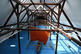 Along with rafts, dugout canoes are among the oldest known watercraft. Archaeological finds date back to the Neolithic period. Here the curator presents the mayor important details about this type of boat.Würden der Dachstuhl den Blick nicht versperren, könnte man meinen, das Auslegerkanu fährt jeden Moment los. Doch die Experimentalfahrten fanden schon in den 90er Jahren auf der Ostsee statt. Die Erlebnisse und Erfahrungen dieser Experimente sind in der Ausstellung künftig anzusehen. //