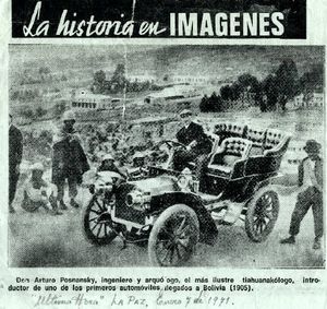 Nach seinem unfreiwilligen Aufenthalt in Europa übersiedelte Posnansky nach La Paz in Bolivien, um dort eine Ausgleichszahlung für seine Dienste an diesem Land einzufordern. Damit scheiterte er jedoch aufgrund eines Staatsbankrotts. Nun betätigte Posnansky sich zunächst vorwiegend als Geschäftsmann im Bereich des Bergbaus und des internationalen Handels. Mit der Zeit wurde er dadurch ein wohlhabender Unternehmer. Während dieser Zeit importierte Posnansky auch das allererste Automobil (Abb. 3) nach Bolivien. [9]