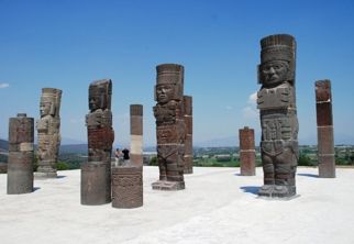 Diese "Atlanten sind etwa zur Hälfte Reproduktion, was leicht an der Farbe zu erkennen ist. Ein Atlant ist komplett original, ein weiteres Original steht im anthropologischen Museum in Mexiko-Stadt im Parque Chapultepec." [2]