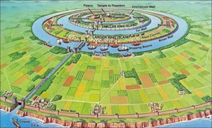 Die Mitte der Hauptinsel bildete eine 3000 mal 2000 Stadien große Ebene. Ein griechisches „Stadion“ beträgt etwa 180 Meter, ein ägyptisches „Stadion“ etwa 211 Meter, daher handelt es sich um eine Größenordnung von 400 bis 600 Kilometern, also fast so groß wie die Bundesrepublik Deutschland. Diese Ebene war von rechtwinklig angelegten Kanälen umgeben und durchzogen, woraus eine Vielzahl kleiner Binneninseln resultierte. Um die Akropolis der Hauptstadt befanden sich drei ringförmige Kanäle, die durch einen breiten Kanal mit dem Meer verbunden waren.