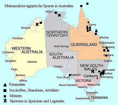Wie diese Karte andeutet, ist der Westen Australiens - dort wo "Colin Amery" angeblich Höhlen voller Lemurier- oder Lumanier-Artefakte gefunden haben soll - alternativ-historisches Ödland: archäologische Anomalien finden sich offenbar lediglich im Norden und Osten des Kontinents.