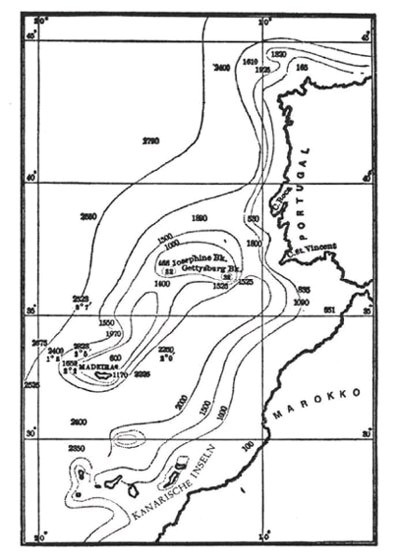 Diese Karte aus dem Werk von Lewis Spence zeigt u.a. die Meerestiefen im Großraum der Kanaren und der nordwest-afrikanischen Küsten. Hier können sich noch innerhalb rezenter Zeiträume gewaltige, geologische Veränderungen (Landabsenkungen) ereignet haben.