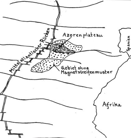 Im Azorenbereich des Atlantik fehlen die Magnetstreifenmuster im Meeresboden völlig. Deutliches Indiz für gravierende geologische Veränderungen vor nur wenigen Jahrtausenden. (Zeichnung: © K. Aschenbrenner)