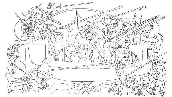 Nachzeichnung eines der Reliefs von Medinet Habu mit Darstellungen des Krieges der Ägypter mit den Seevölkern