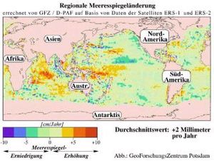 Mit Hilfe von Radarsatelliten wurde das gesamte Relief der Erdoberfläche und des Meeresbodens abgebildet (Abb. 1). Durch die Messungen von ERS-1 und Topex/Poseidon wurden die relativen Meeresspiegelhöhen und deren Veränderungen bestimmt. Nach der Fertigstellung dieser Bilder zeigten sich mehrere Auffälligkeiten. So wurden relative Meeresspiegelerhöhungen von bis zu 10 cm/Jahr im nördlichen Indischen Ozean, mit Sri Lanka im Zentrum, festgestellt. Dort liegt das Meeresspiegelniveau aber immer noch bis zu 105 m unter NN (Abb. 3a).