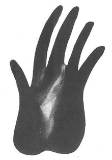 Interessant ist in diesem Zusammenhang insbesondere ein paläo-atlantisches Kultur-Phänomen, das Stacy-Judd als 'Zeichen der Hand' (Abb. 3) vorstellt. "Das Zeichen der Hand", erläutert er, "ist ein Brauch, der, aus ältesten Zeiten stammend, bis heute überdauert hat. Vor mindestens fünfundzwanzigtausend Jahren hat es ihn bei den Cro-Magnon des Aurignac gegeben". [5] Über die ältesten Exemplare dieses Zeichens in Südwest-Europa schrieb Harmer (in: 'Wonders of the Past'): "In einigen Höhlen finden sich Silhouetten menschlicher Hände, bei denen das lebende Objekt durch Umrandung oder mittels seines Abdrucks abgebildet ist. [...] Bei Gargas, im Distrikt der Französischen Pyrenäen, wo es 150 solcher Designs (Hände) gibt, weisen die meisten von ihnen amputierte Finger auf." [6]
