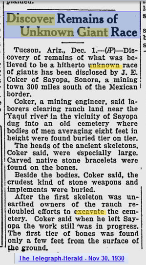 (bb) Zu den Berichten über Funde riesenhafter menschlicher Skelettreste in Mexiko während des 20. Jahrhunderts, die auch bei US-amerikanischen Zeitungen auf Interesse stießen, gehören - neben den Entdeckungen des Paxson Hayes - die Funde eines gewissen J.E. Coker, die ebenfalls in der Provinz Sonora erfolgt sein sollen. Über sie haben wir bereits kurz (unter Beuugnahme auf einen Artikel des Blattes The Milwaukee Sentinel [1]) aus Wisconsin in unserem längeren Beitrag "Weitere Riesen-Funde in Mexiko" hingewiesen. In Anbetracht der Tatsachen, dass es zu diesen Entdeckungen damals auch noch eine Folgeberichterstattung gab, und dass ihnen offenbar seitens der University of Arizona einiges Interesse entgegengebracht wurde, wollen wir etwas ausführlicher über sie informieren. Dazu nachfolgend zunächst ein auf einer Meldung der Nachrichtenagentur Associated Press basierender Artikel (Abb. 1), der Anfang Dezember 1930 - direkt nach Bekanntwerden des Fundes in Nexiko - in der Zeitung The Telegraph Herald aus Dubuque, Iowa, erschien:
