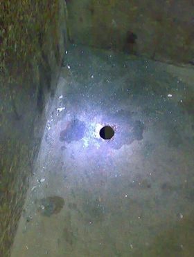 Wer hat zum Beispiel die drei massiven Bohrlöcher im Boden der Königskammer verursacht, die Stefan Erdmann im Jahr 2007 festgestellt und von denen er eines fotographiert hat (Abb. 8) - und in wessen Auftrag sowie zu welchem Zweck wurden diese Bohrungen vorgenommen? Wer ist für den unfachmännischen Einbau von Metall-Stiegen verantwortlich, die nun im oberen Bereich der Pyramide zu den jeweiligen Entlastungskammern führen. Über sie berichtete der ägyptische Antiken-Schützer Osama Karar (Abb. 9) im Februar 2014 in einem Radio-Interview [11], und auch die beiden deutschen Privatforscher Erdmann und Görlitz konnten sich bereits im vergangenen Jahr von ihrer dilettantischen Ausführung überzeugen. [12]