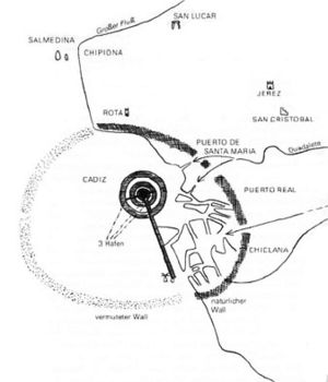 Die einzigen greifbaren Reste ihrer Kultur haben wir in ihren Bauten vor uns, die aus zyklopischen Steinblöcken errichtet oder in den Fels gehauen waren. Die Hauptstadt des Atlantischen Reiches lag auf dem Felsen, der heute von der Stadt Cádiz bedeckt wird. (Abb. 1) Obgleich sie damals neun Kilometer von der Küste entfernt im Lande lag, hatte sie drei Häfen, die durch einen breiten Kanal mit dem Ozean verbunden waren. Die Grundzüge dieser Anlage sind noch heute erkennbar.