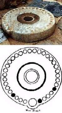 Die Mallia-Tafel (Abb. 1) wurde im Innenhof des minoischen Palastes von Mallia auf Kreta entdeckt. Sie ist ein großer Sandstein-Diskus mit einem Durchmesser von 90 Zentimetern und einer Dicke von 36 Zentimetern. Entlang ihrer Umrandung befinden sich 33 Mulden von gleicher Größe. Eine 34. Vertiefung ist größer und befindet sich auf einer Art 'Ohr', das über den normalen Umfang des Diskus hinausragt.