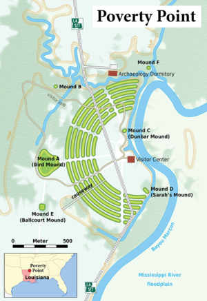 Die monumentale Konstruktion wird von einer Gruppe aus sechs konzentrischen, sichelförmigen Kamm-Erdwerken gebildet, unterteilt durch fünf Gänge, die von ihrer Mitte zum Ufer hin verlaufen. Die Stätte weist auch mehrere Mounds auf, sowohl auf der Außenseite als auch im Inneren der Ring-Erdwerke. Der Name "Poverty Point" geht auf die Plantage zurück, welche einst den Ort umgab. Die Vereinigten Staaten nominierten Poverty Point im Januar 2013 für die Aufnahme in die Liste des UNESCO-Weltkulturerbes.