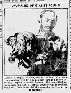"Tucson, Arizona - (INS) - Spuren einer verschollenen Rasse von Riesen, die orientalische Turbane trugen und ihre Toten auf eine Weise mumifizierten, die jener der alten Ägypter ähnlich ist, sind im Land der Yaqui-Indianer in Sonora, Mexiko,gefunden worden.