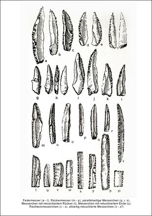 - 1) Hermann Schaaffhausen (1816-1893), Der Neanderthaler Fund, Bonn 1888, in: Pierre Honoré, Das Buch der Altsteinzeit, Econ-Verlag, Düsseldorf u. Wien 1967; via: Goldi64, bei Wikipedia - Die freie Enzyklopädie, unter: Datei:FedermesserSteinzeit.jpg