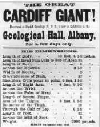 Welchen Schaden angebliche Riesen-Funde und Fälschungen im Bereich wissenschaftlicher Forschung allgemein, und insbesondere für die Gigantologie, angerichtet haben, zeigt anschaulich das Beispiel des 'Giganten von Cardiff', oder auch 'Gips-Riesen' (Abb. 4), der in den späten 1860er Jahren in den USA einen ungeheuren Wissenschafts-Skandal auslöste. Hier war es allerdings - vice versa - ein "Rationalist" und Kritiker bibelfester Riesen-Freunde, der für einen echten Skandal sorgte. C. W. Ceram (Kurt W. Marek) schilderte diese "wahre, moralische und ergötzliche" Begebenheit 1971 in seinem Werk "DER ERSTE AMERIKANER":