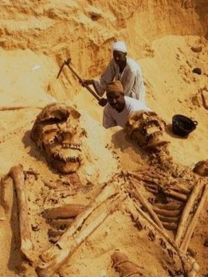 "Eine kürzliche archäologische Grabung hat in der Nähe der altertümlichen Ruinen von Rujm el-Hiri, auf den Golanhöhen, einem umkämpften Gebiet, auf das sowohl Syrien und Israel Anspruch erheben, nicht weniger als zwei Dutzend Skelette von gigantischen Proportionen zu Tage gefördert. Das Team von Archäologen unter Leitung der Universität Tel-Aviv macht geltend, dass die Skelette älter als die Ruinen selber sein könnten, die, der Mainstream-Archäologie zufolge, ohnehin auf 5000 Jahre zurückdatieren.