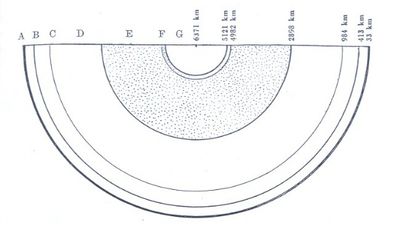 Abb. 4 Zeitgenössische Vorstellung des Erdinneren um 1950, abgeleitet aus Studien der Geschwindigkeit seismischer Wellen (aus: Malaise, 'Atlantis, a Geological Reality', schwedischsprachige Originalausgabe, 1951)
