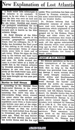 Eines von Dr. Malaises Kernargumenten zur Beweisführung des rezenten Untergangs großer Teile des, vormals über Meeresniveau liegenden, Mittelatlantischen Rückens war paläobiogeographischer Natur. Hier konnte er sich auf aktuelle Entdeckungen seines schwedischen Forscherkollegen, des Ozeanographen R. W. Kolbe berufen. [10] Dazu hieß es in einem Artikel (Abb. 7) der New York Times aus dem Jahr 1956, der sich mit Malaises Theorie zum Absinken zentralatlantischer Landstrecken befasst: "Dr. René Malaise vom Riksmuseum, Stockholm, berichtet im schwedischen geographischen Magazin Ymer, dass sein Kollege Dr. P.W. Kolbe [richtig: R.W. Kolbe; bb] mit einer Studie über Diatomeen, mikroskopische Formen von Algen, welche sowohl in Süß- als auch in Sazwasser vorkommen, den endgültigen Beweis für dieses Absinken erbracht hat. Wenn diese Algen absterben, sinken sie auf den Grund und ihre harten, toten Schalen sammeln sich im Sediment und sickern ein. Dr. Kolbe studierte Diatomeen aus einem Bohrkern, der von schwedischen Wissenschaftlern im tropischen Atlantik aus einer Tiefe von 12000 Fuß [ca. 3657 m; d.Ü.] entnommen wurde. Einige der Diatomeen [...] waren reine Süßwasser-Typen, was beweist, dass das Sediment, aus welchem sie emporgeholt wurden, einst Teil eines Sees war.