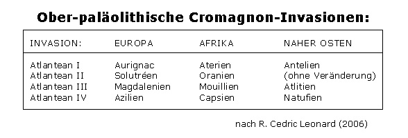 In meinem Buch Quest for Atlantis schrieb ich: "Ein so genannter 'Aurignac'-Außenposten könnte in Palästina existiert haben. Letzterer, als Antelien bekannt, existierte zur gleichen Zeit wie die Aurignac-Kultur im Westen und wies eine Anzahl von Aurignac-Charakteristika auf." Zweifellos datiert dieser isolierte 'Außenposten' mehr als 30 000 Jahre zurück. Diese Kultur wird als "intrusiv" betrachtet, da sie starke Affinitäten zum Aurignac in Europa aufweist (Coon, 1954; Bordes, 1968; Pfeiffer, 1969, et al.). Darüber hinaus sind die physischen Charakteristika dieser Leute so gut wie identisch mit den westeuropischen 'Invasoren', mit denen wir uns beschäftigt haben. [2]