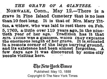 "Norwalk, Connecticut, 12. Mai - Auf dem Friedhof von Pine Island gibt es ein Grab, das nicht weniger als zehn Fuß [ca. 3,05 m; d.Ü.] lang ist. Es ist das von Mrs. Mary Titus, einer Witwe, die dort am 5. Februar 1769 zur letzten Ruhe gebettet wurde, vor wenig mehr als 110 Jahren, [gestorben] in ihrem 90. Lebensjahr. Die Überlieferung besagt, das Mrs. Titus eine Riesin war, was die enorme Länge ihres Grabes vollständig erklärt. Es befindet sich in einer entlegenen Ecke des großen Friedhofs, und seine Existenz ist fast in Vergessenheit geraten. Vor einigen Tagen wurde es von ein paar Städtern entdeckt, die hier zu Besuch sind." [1]