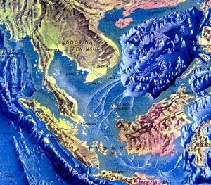 Abb. 1 Der heutige Meeresboden der Sunda-Ebene. Der Vulkan Krakatau befindet sich zwischen den beiden Land-Strukturen unten in der Mitte. (Karte: National Geographic Society.)