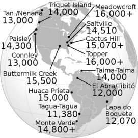 - ↑ Anmerkung: 1997, mit der "Authentisch-Sprechung" der Fundstätte von Monte Verde (Chile) durch eine bestellte Archäologen-Jury (vergl. dazu: Wir haben es ja schon immer gewusst! von William R. Corliss) wurde der 'Temporale Limes' zu einer "10.500-Jahre-v.Chr.-Grenze". Offiziell war das 'Clovis-Zeitalter' damit zwar beendet, doch die vorherrschende Lehrmeinung war dadurch allenfalls etwas "geliftet", aber nicht grundlegend revidiert worden.
