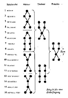 Aus diesen sechzehn Punkt- oder Strichreihen werden nun, nach traditioneller „Gebrauchsanleitung“, gewisse einfache Figuren konstruiert: zuerst die „Mütter“, dann die „Töchter“ und zuletzt die „Enkelin“. Die „Enkelin“ ist sozusagen das Hauptergebnis, aber je nach Lage des Falles können die „Töchter“ und „Mütter“ in den Deutungsprozeß miteinbezogen werden.