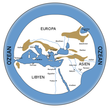 Hekataios von Milet (ca. 550-476 v.Chr.) war einer der frühesten griechischen Geographen. Seine Weltsicht bestand darin, dass die nach damaliger Ansicht existierende Landmasse, mit dem Mittelmeer im Zentrum, umgeben von Europa und Teilen Afrikas und Asiens, welche alle vom Großen Ozean oder Okeanos umschlossen sind.
