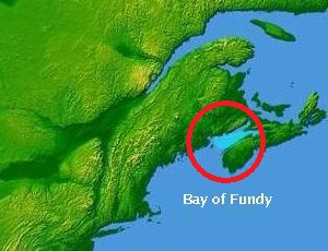 Dort habe es die proto-hellenischen 'Globetrotter' in die kanadische Fundy-Bucht (engl.: Bay of Fundy) (Abb. 5) verschlagen. Diese, durch ihre massiven Tiden und Strömungen unter Seeleuten berüchtigten Bucht bei der Halbinsel Nova Scotia identifizierte Mertz als jenen Ort, wo die Gefährten in der Odyssee von den 'Monstern' Skylla und Charybdis attackiert werden, welche ihr Schiff zu zerschmettern und 'mit Mann und Maus' in die Tiefe zu ziehen versuchen; nach Henriette Mertz eine typische Mythisierung von Naturgewalten. [25] Wie die Odyssee interpretiert sie auch die sagenhaften Fahrt der Argonauten unter Iason als transatlantische Reise. Diese seien an die Ostküste Südamerikas gelangt, an welcher sie bis zur Amazonas-Mündung entlang fuhren, und dann weiter zum Rio de la Plata. Von dort gelangten Iason und seine Mannschaft, H. Mertz zufolge, auf den bolivianischen Altiplano und nach Tiahuanaco, wo sie das Goldene Vlies fanden.[26]