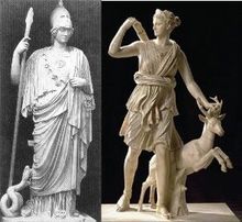 Außerdem gab es auch die "ägäischen Amazonen. Signifikante, doch unklare Spuren der Amazonen gibt es im ägäischen Becken (Griechenland). So die Haupt-Schreine von Kriegs-Göttinen - Athena und Artemis - standen in diesem Gebiet (Athen, Insel Delos, Ephesus). Auch viele mythische Taten dieser Göttinnen und echter Amazonen fanden in diesem Gebiet statt. Diese Mythen erklärten das mit einer Invasion der Amazonen. Jedenfalls gibt es Grund zu der Annahme, dass, ganz im Gegenteil, die Amazonen aus diesem Gebiet von jenen Völkern vertrieben wurden, die Anteil an der Herausformung der späteren griechischen Nation hatten." [8]